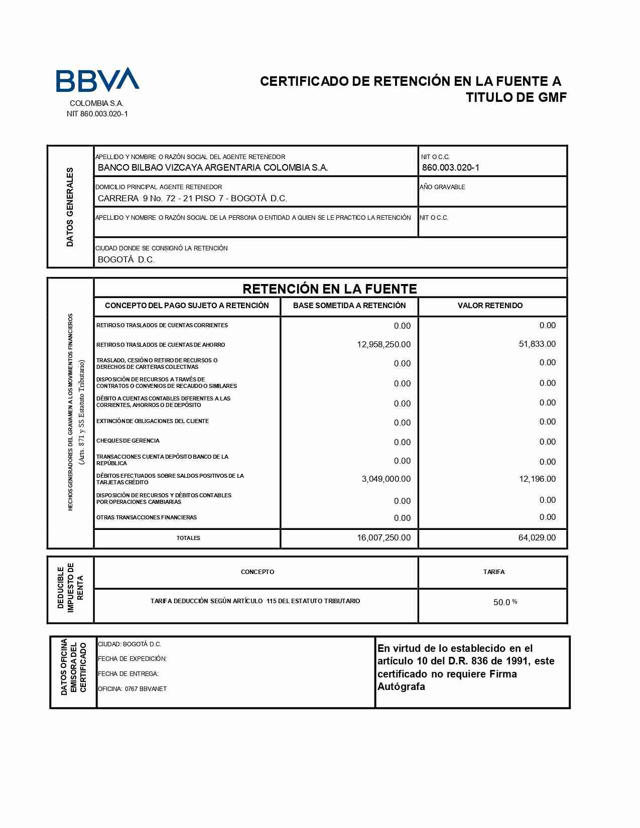 Es un documento que expide el Banco BBVA y que te muestra el total del GMF (Gravamen a los Movimientos Financieros) que te practicaron durante el Año Gravable 2024 en tus productos financieros.