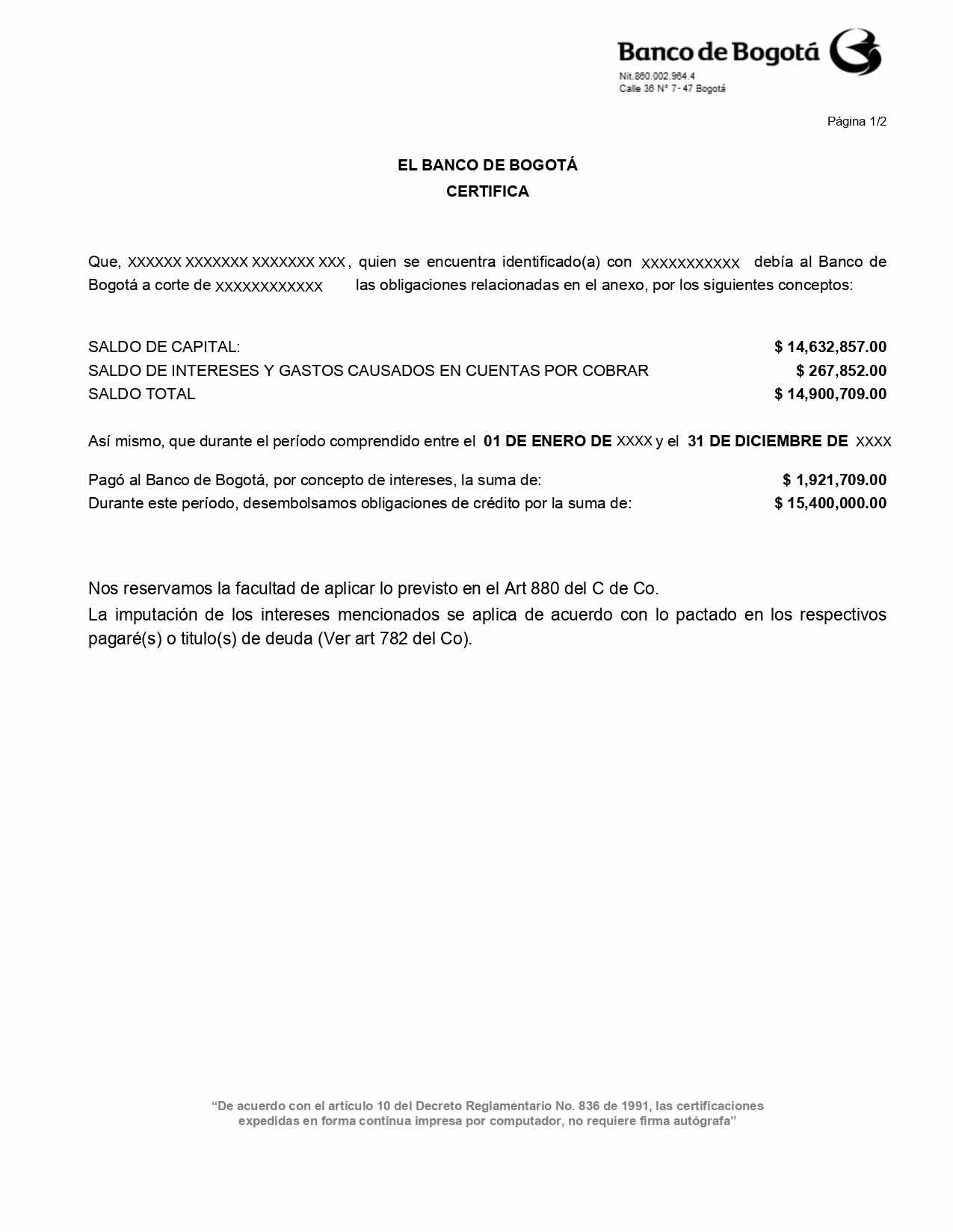 Es un documento expedido por el Banco de Bogotá donde puedes consultar el saldo de tus créditos al 31 de diciembre del año gravable dato:AG. Ya que tuviste un crédito con esta entidad, te solicitamos este certificado para completar correctamente tu declaración.