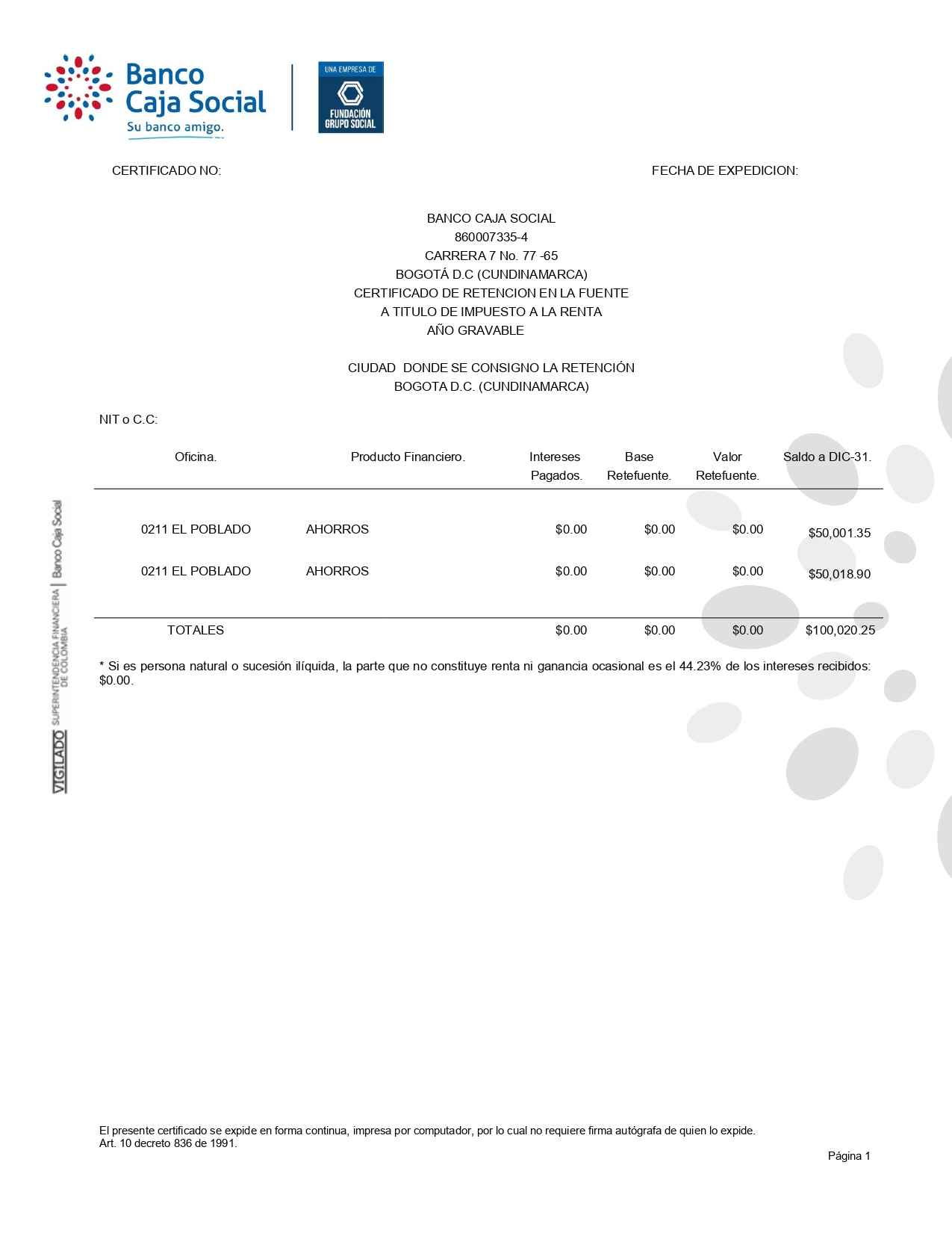 Es un documento que expide el Banco Caja Social donde puedes encontrar la siguiente información: el saldo de los productos que tenías con esta entidad, los intereses que te pagaron y la retención que te practicaron al 31 de diciembre del año gravable 2024. Como tenías productos financieros con esta entidad, te solicitamos este certificado para tu declaración del año gravable 2024.