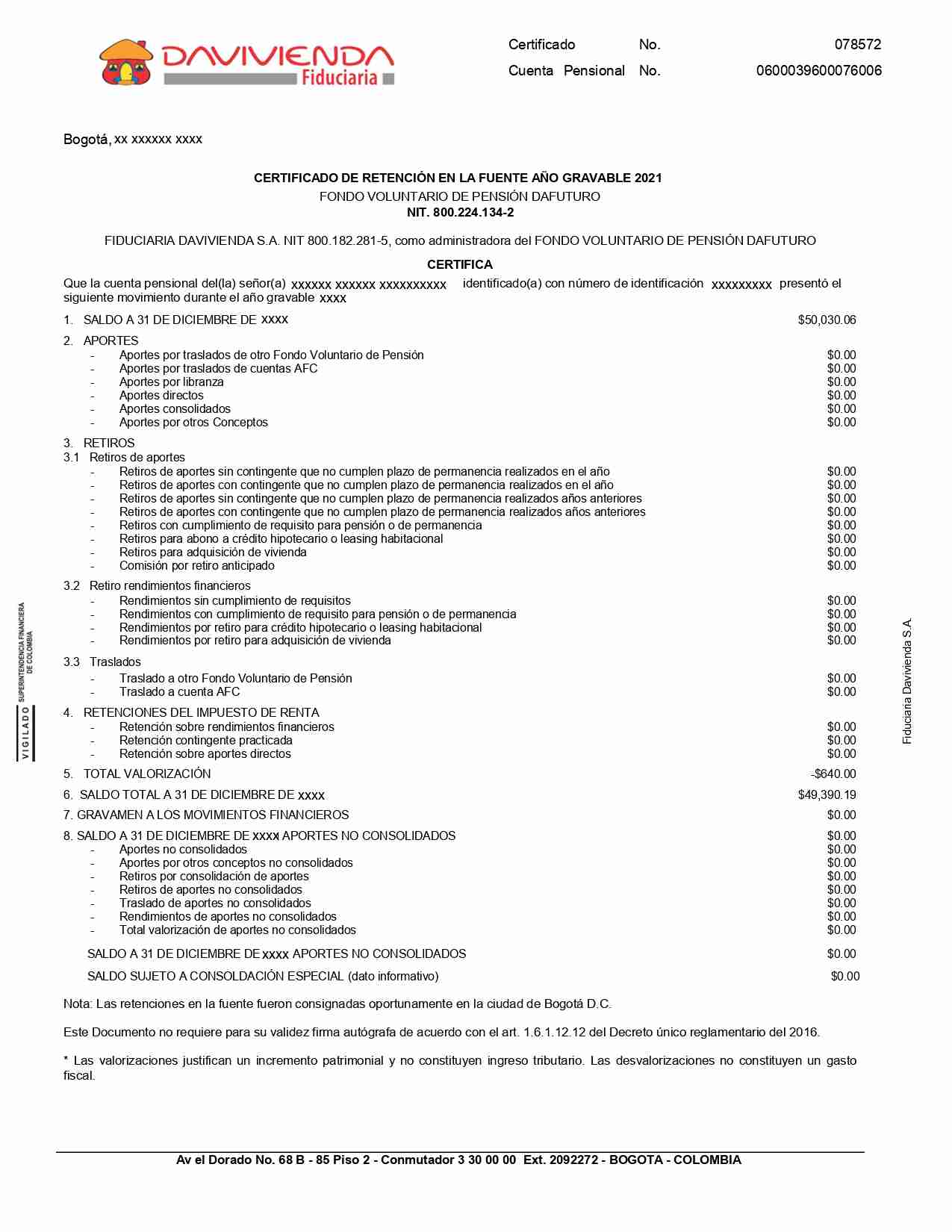 Es un documento que certifica que cuentas con un fondo voluntario de pensiones en Davivienda. Refleja información como: valor de los aportes, retiros, retenciones practicadas y movimientos del año que desees consultar.