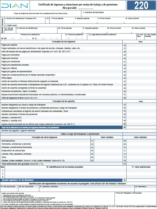 El certificado que te deben entregar es un formulario estándar emitido por la DIAN, completamente diligenciado y en formato PDF.