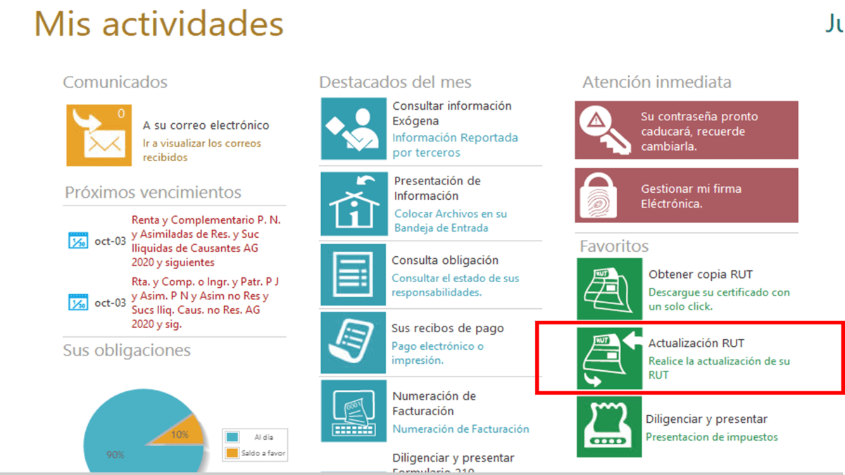 En la parte superior derecha, en la sección de favoritos se encuentra "Actualización de RUT".