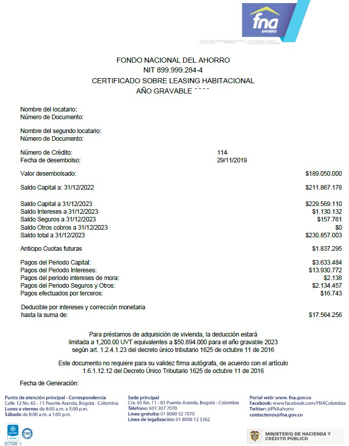 Es un documento que expide el Fondo Nacional del Ahorro donde puedes encontrar la siguiente información: el saldo del crédito, el GMF (Gravamen a los Movimientos Financieros) y el valor total de los intereses que pagaste en el año gravable 2024, este último dato es muy importante, ya que puede ser deducible de tu declaración de renta.