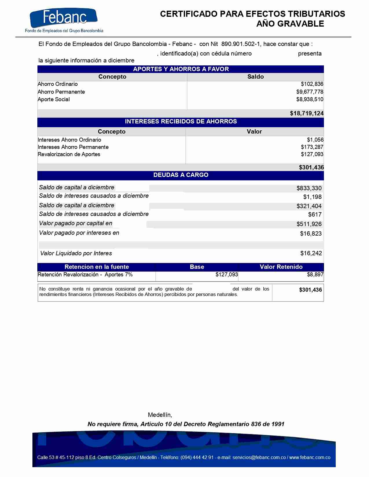 Es el documento que certifica los ahorros que tuviste con el fondo Febanc, el fondo de inversión de los colaboradores de Bancolombia y filiales. En el certificado se reportan el saldo de tus ahorros y créditos, los intereses que te pagaron y el valor de las retenciones que te practicaron al 31 de diciembre del año gravable 2024.