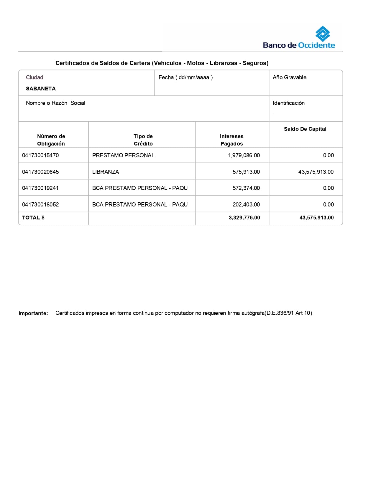 Es un certificado expedido por el Banco de Occidente en el que encontrarás: