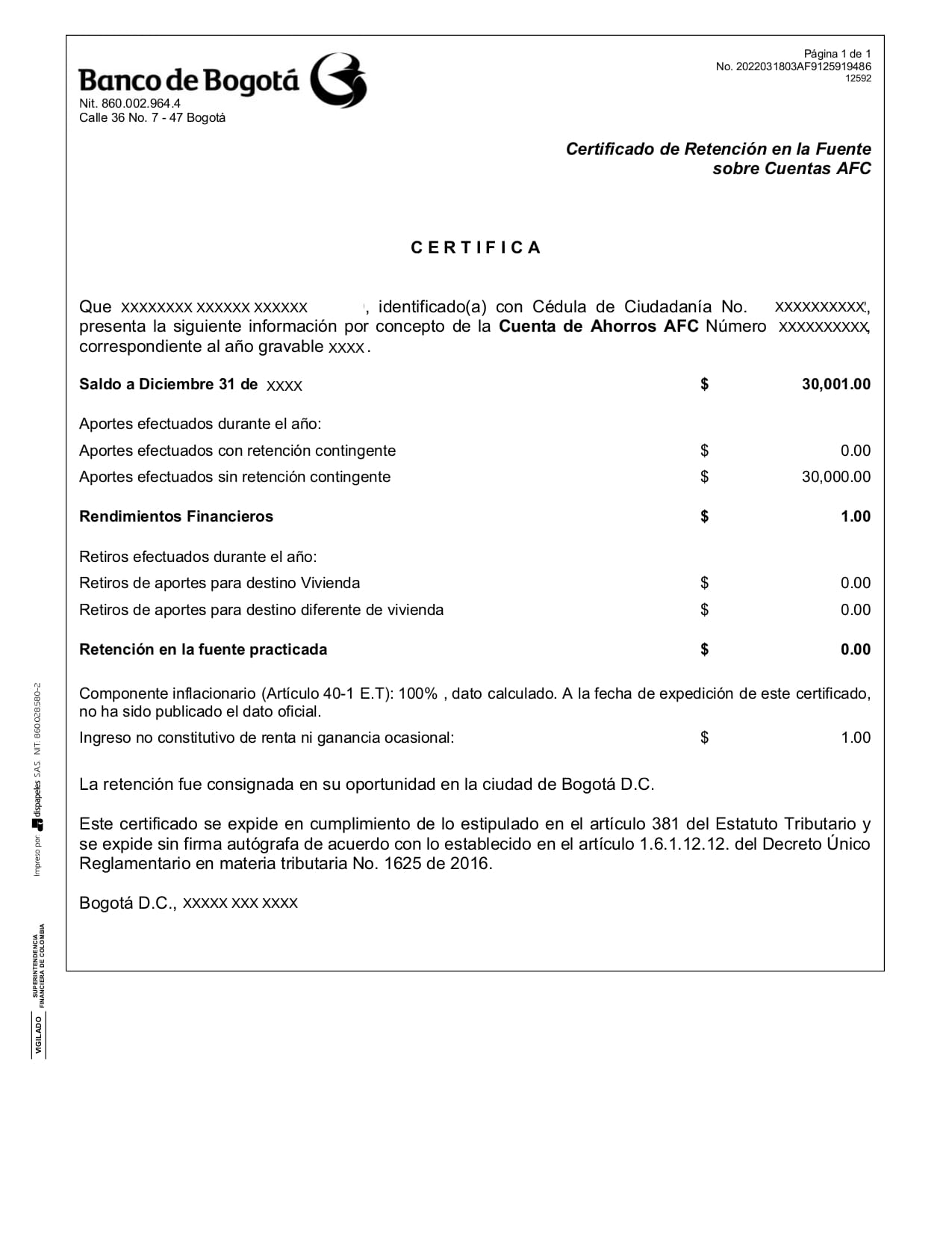 Es un documento expedido por el Banco de Bogotá que contiene la información de las cuentas AFC que tenías con esta entidad al 31 de diciembre del año gravable dato:AG y que incluye los siguientes datos: saldo de la cuenta AFC, movimientos, intereses pagados y valor de la retención en la fuente aplicada durante el año. Ya que tuviste una cuenta de Ahorro para el Fomento a la Construcción (AFC) con esta entidad, te solicitamos este certificado para tu declaración de renta.