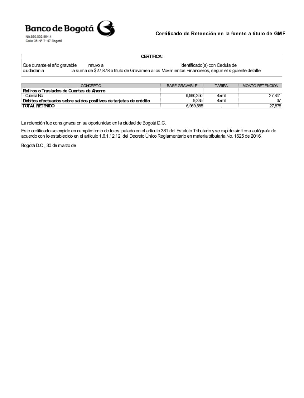 Es un documento expedido por el Banco de Bogotá y contiene el valor del GMF (gravamen a los movimientos financieros) que pagaste en tus productos durante el año. Esta información es clave, ya que puede ser usada como deducción en tu declaración de renta. Como tuviste productos financieros con esta entidad durante el año gravable dato:AG, te solicitamos este certificado.