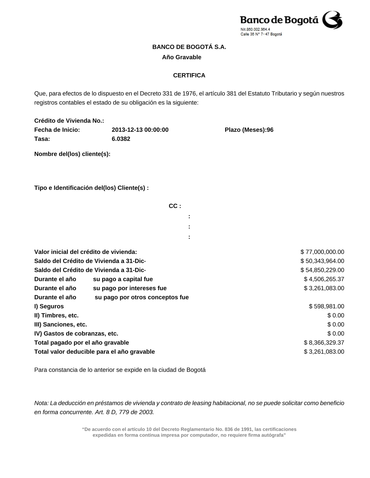 Es un documento que detalla la información de tu crédito hipotecario o leasing habitacional con el Banco de Bogotá al 31 de diciembre del año gravable dato:AG. En él se incluyen el saldo del crédito, el valor del GMF (Gravamen a los Movimientos Financieros) y el total de los intereses pagados durante el año. Este último valor es especialmente importante, ya que puede ser deducible en tu declaración de renta.