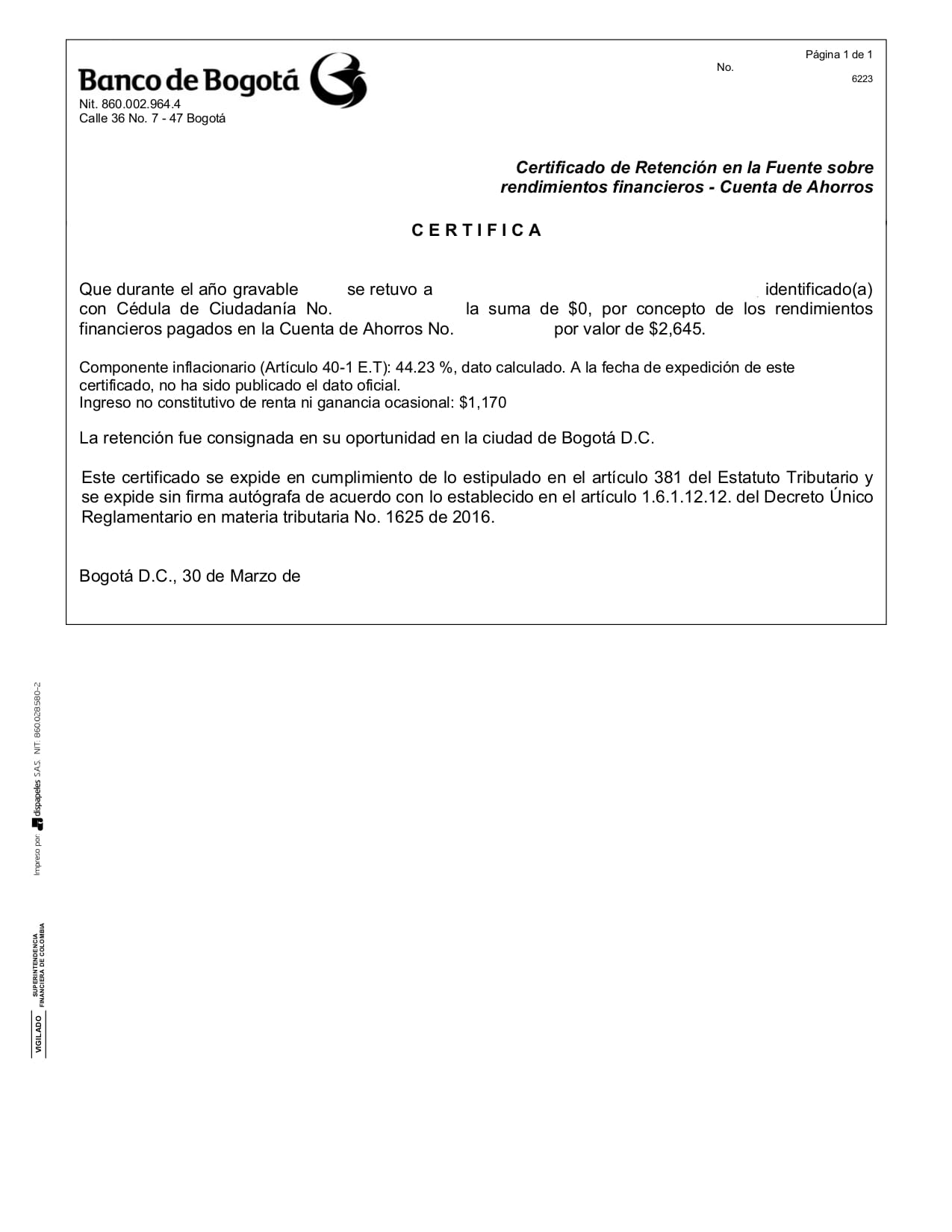 Es un documento expedido por el Banco de Bogotá que contiene la información de los intereses que te pagaron en la cuenta de ahorros al 31 de diciembre del año gravable dato:AG. Como tuviste una cuenta de ahorros con esta entidad durante ese año, te solicitamos este certificado.