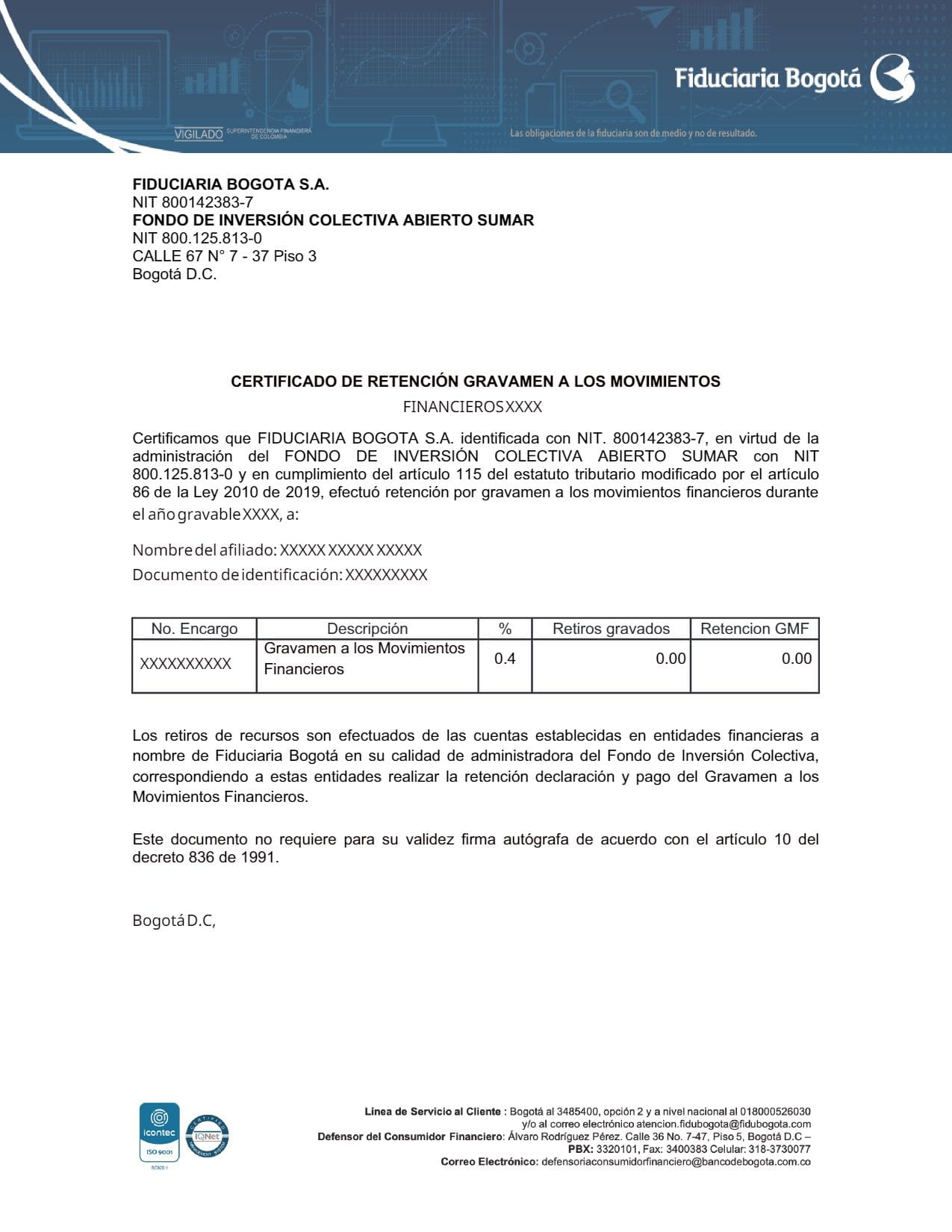 Es un documento expedido por el banco que contiene la información del GMF (Gravamen a los Movimientos Financieros) cobrado por la Fiduciaria Bogotá durante el año gravable dato:AG. Ya que tenías productos financieros con esta entidad, te solicitamos este certificado.