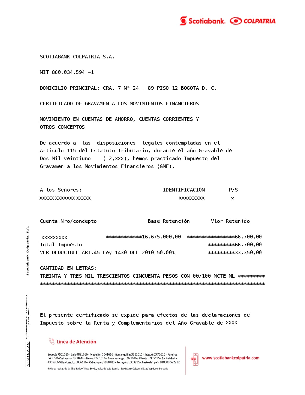 Es un documento que expide Scotiabank Colpatria donde puedes encontrar la siguiente información: el valor que te cobraron por GMF (Gravamen a los Movimientos Financieros) durante todo el año gravable dato:AG. Este dato es importante, ya que puede ser deducible en tu declaración de renta.