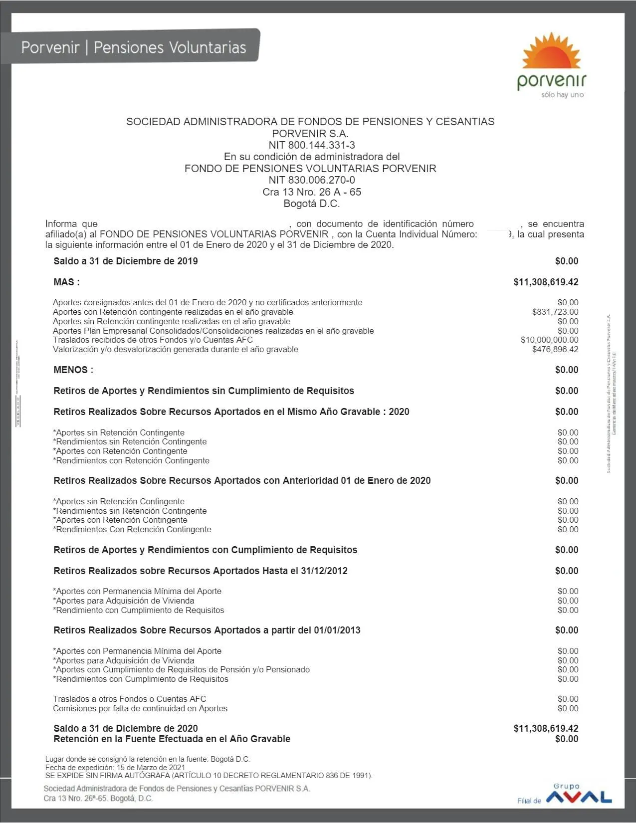 Es un documento que certifica tus aportes en pensiones voluntarias de Porvenir para el año dato:AG. Contiene información como: valor de los aportes, retenciones practicadas y movimientos del año.